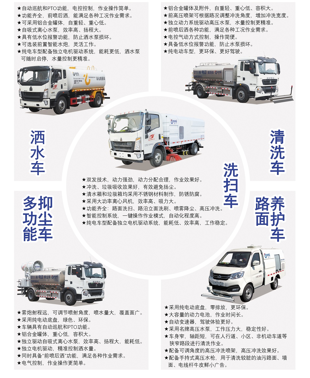 運(yùn)力牌灑水抑塵洗掃類環(huán)衛(wèi)車有灑水車(綠化噴灑車)、清洗車、多功能抑塵車、路面養(yǎng)護(hù)車和洗掃車共五大類,車型種類多,滿足各類需求。灑水車、清洗車、抑塵車可采用鋁合罐體,自重輕,容積大,連續(xù)作業(yè)里程長(zhǎng),節(jié)能省油。車輛自動(dòng)化程度高,功能齊全,操作簡(jiǎn)便,使用效率高,是城市灑水、洗掃、降塵作業(yè)的理想選擇。